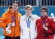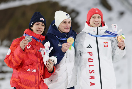ノルディックスキー・ジャンプ男子個人ラージヒルの表彰式で記念撮影する(左から)銀メダルの二階堂蓮、金メダルでスロベニアのプレブツ、銅メダルでポーランドのトマシャク=14日、プレダッツォ