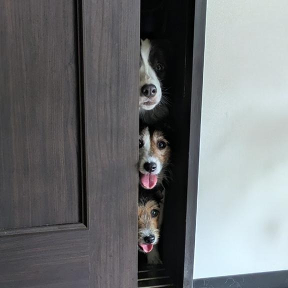 3匹のワンちゃん、まるで「ブレーメンの音楽隊」 身長順に並び…“入室NG”部屋に興味津々