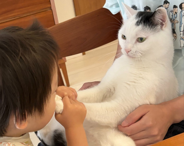 2歳の男の子が“肉球”の魅力に気がづいた瞬間を撮影した写真がXに投稿され、表示回数197万件超え、12万「いいね!」が付く反響を呼んでいる(31日午後5時時点…