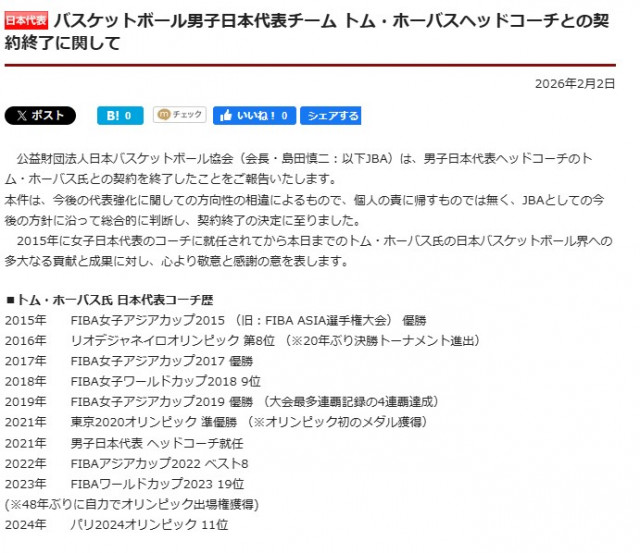 日本バスケットボール協会は2日、男子日本代表ヘッドコーチのトム・ホーバス氏との契約を終了したと発表した。「今後の代表強化に関しての方向性の相違によるもので、個…