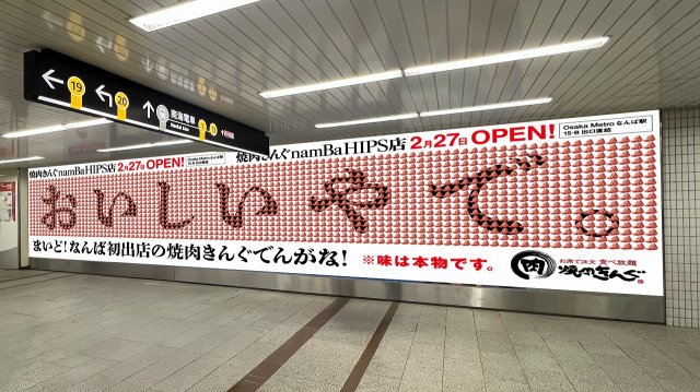 焼肉食べ放題専門店「焼肉きんぐ」の巨大な“肉”広告が、大阪メトロなんば駅に9日から掲出開始された。「焼肉きんぐ namBaHIPS店」が、2月27日にオープン…