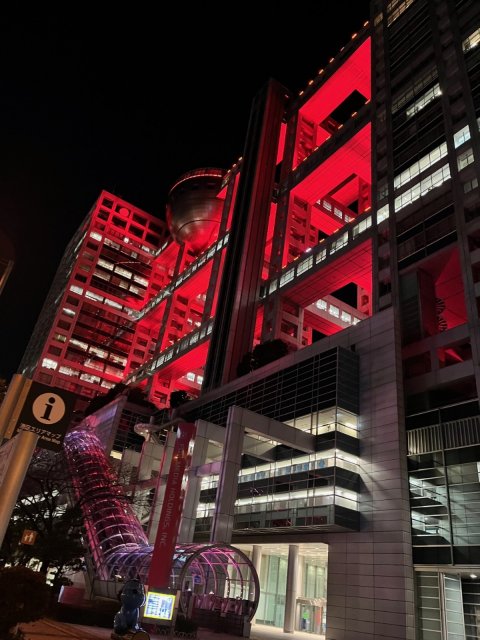 フジテレビ、お台場の社屋を“F1”カラーに特別ライトアップ&巨大階段装飾 近鉄電車まるごとジャックも