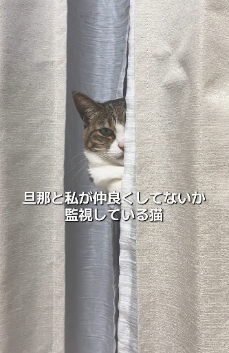 カーテンの隙間から監視猫がジロり…夫が大好きすぎて家庭内の”懐き方”に差、妻の嘆き「私はいつもご飯係」