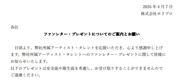 ホリプロがきょう7日、公式サイトにて文書を公開。「ファンレター・プレゼント」について注意を呼びかけた。 【画像】「ファンレター&プレゼント」NGの7項目 …
