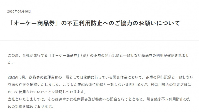 スーパー「オーケー」は6日、同社サイトに「『オーケー商品券』の不正利用防止へのご協力のお願いについて」を掲載した。 【一覧】はま寿司が公表した事故の経緯と今…