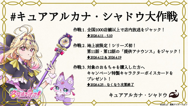 そして今回、キュアアルカナ・シャドウ変身を記念して、本日12日放送の第11話、19日放送の第12話では、CM前後に流れる「提供アナウンス」をキュアアルカナ・シャドウが担当することに。地上波放送でしか聞けない特別なアナウンスとなり、シリーズで初めてプリキュアが提供アナウンスを務めた。