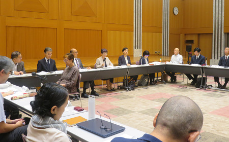 宮城県漁業協同組合などは、県産の生食用むき身カキの出荷に先立つ品質検査会を同県石巻市で開いた。県内34カ所の処理場からカキが集められ、県漁協職員らが粒の大きさや卵の入り具合を確認=1日、宮城県石巻市
