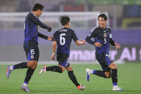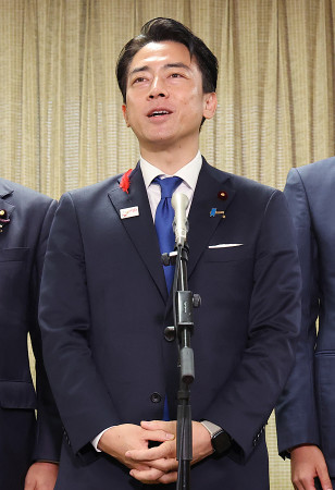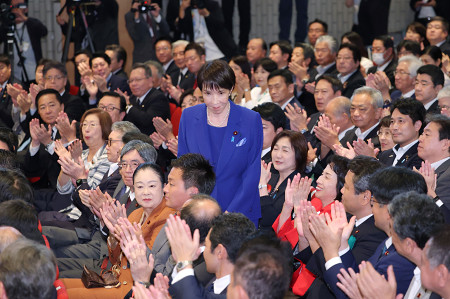 自民党は4日、総裁選の投開票を行い、高市早苗前経済安全保障担当相(中央)を第29代総裁に選出した。決選投票で小泉進次郎農林水産相を下し、自民党初の女性総裁に就任=同日午後、東京・永田町