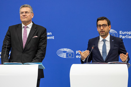 欧州連合(EU)欧州委員会は7日、無関税の輸入枠を超過した鉄鋼に対する関税率を現行の25%から50%に引き上げる方針を発表した。写真は記者会見するセジュルネ上級副委員長(右)とシェフチョビッチ欧州委員