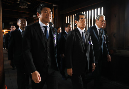 秋季例大祭で、靖国神社に参拝する自民党の古屋圭司選対委員長(右端)ら超党派の「みんなで靖国神社に参拝する国会議員の会」=17日午前、東京都千代田区