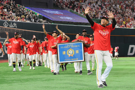 大阪・関西万博の公式キャラクター「ミャクミャク」の像が、市民に感謝を伝えるためだとして、大阪市役所の正面玄関に帰ってきた。2023年12月に市役所前に設置され、25年7月に会場に移設されていた=20日