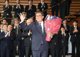 ファッションブランド「ブルネロ クチネリ」銀座店のリニューアルオープンセレモニーにブルネロ・クチネリ会長、小雪さん、渡辺謙さんが出席。この日66歳の誕生日を迎えた渡辺さんにケーキが贈られた=21日