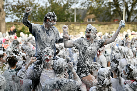 歓迎の「泡合戦」