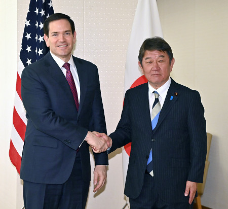 茂木敏充外相(右)は28日、来日中のルビオ米国務長官と外務省で就任後初めて会談し、日米同盟の抑止力・対処力を強化することで一致した。経済安全保障分野の連携を進めることも確認した。(代表撮影)