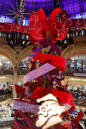 パリの老舗デパート「ギャラリーラファイエット」で12日、シンボルのガラスドームの下に設置された巨大クリスマスツリーの点灯式が行われた。同デパートのツリーは76年以来、パリのXマスシーズンを彩っている。