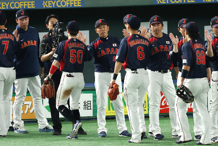 野球日本代表「侍ジャパン」は16日、東京ドームで韓国代表との強化試合第2戦に臨み、7―7で引き分け、1勝1分けで終えた。写真は選手を迎える井端監督(中央)。