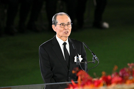 プロ野球巨人の選手、監督として活躍し、6月に89歳で死去した長嶋茂雄さんのお別れの会が21日、東京ドームで営まれた。写真は、お別れの言葉を述べる王貞治氏。