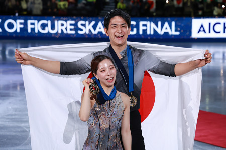 フィギュアスケートのグランプリ(GP)シリーズ成績上位6人(組)で争うファイナル。ペアは三浦璃来、木原龍一組が今季世界最高の合計225.21点で3年ぶり2度目の優勝を果たした=5日、愛知・IGアリーナ