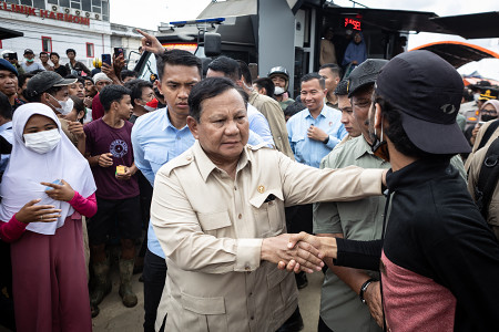 インドネシア国家災害対策庁によると、11月末に西部スマトラ島を襲った豪雨による死者が13日、1006人となった。写真は12日、スマトラ島北部のアチェ州の避難所で被災者を見舞うプラボウォ大統領(中央)。