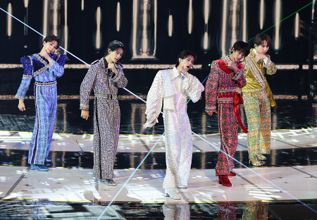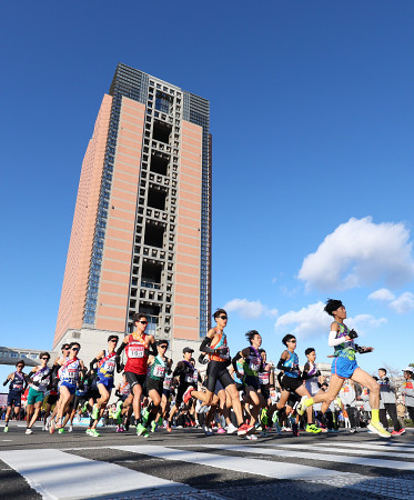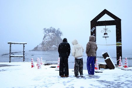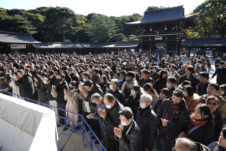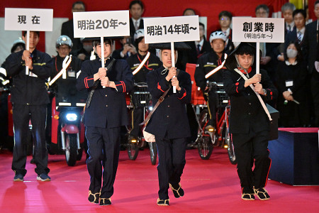 明治時代の制服姿で年賀状を配達する郵便局員と、受け取る飲食店の関係者=1日午前、東京都新宿区
