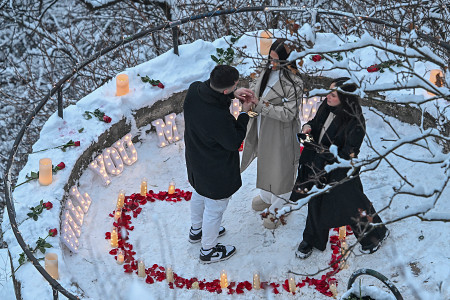 6日、ドイツ南部ガルミッシュパルテンキルヘンで開催された伝統的なそり大会に参加する人たち。木製のそりに乗り、雪煙を上げながら斜面を一気に駆け下りた。