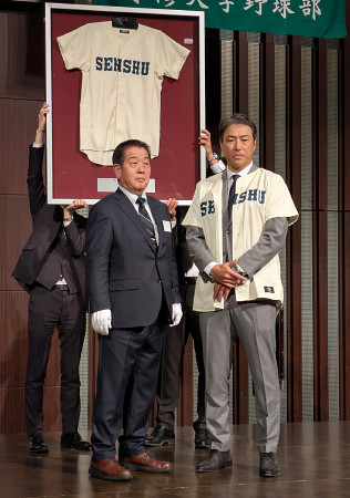 専大野球部の創部100周年記念祝賀会が17日、東京都内で開かれ、OBや部員、関係者ら約500人が出席した。写真は、特別功労賞を受賞した黒田博樹さん(右)。