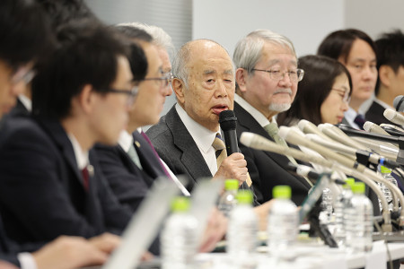 記者会見する角川被告