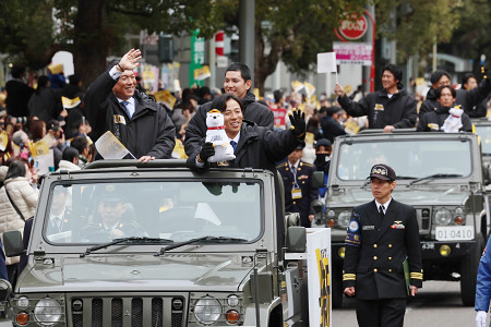 入団会見に臨んだ中日の新外国人、サノー(左)とアブレウ。サノーは「日本でプレーする機会をもらえてうれしい。自分の本塁打や能力を見てほしい」と語った=31日、沖縄県北谷町