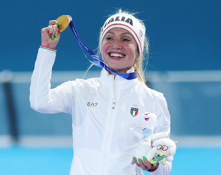 スピードスケート女子3000メートルで金メダルを獲得し、喜ぶイタリアのロロブリジダ=7日、ミラノ郊外