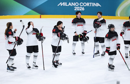ミラノ・コルティナ五輪第4日は9日、アイスホッケー女子の日本が1次リーグB組の第3戦で地元イタリアと対戦し、2―3で敗れて通算1勝2敗となった。写真は悔しそうな表情を見せる日本の選手。