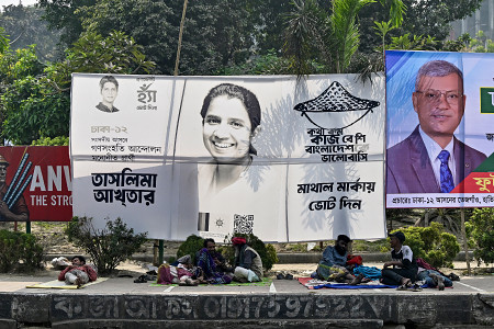バングラデシュで、2024年の政変以来初となる総選挙(一院制、定数350)の投票が12日始まった。写真はダッカに掲示されたバングラデシュ総選挙のポスター=11日