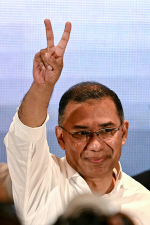 記者会見するラーマン党首