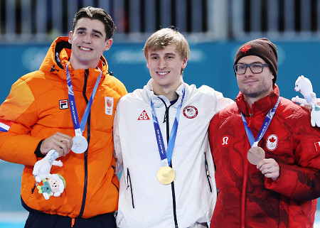 スピードスケート男子500メートルで金メダルを獲得した米国のストルツ(中央)。左は銀メダルでオランダのデボー、右は銅メダルでカナダのデュブルイユ=14日、ミラノ郊外