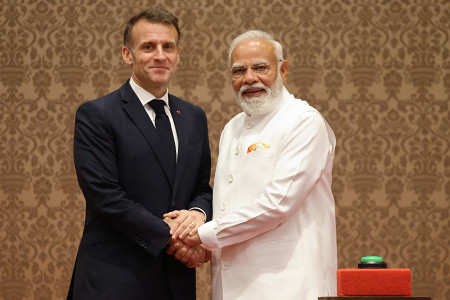インドのモディ首相(右)は17日、西部ムンバイでフランスのマクロン大統領と会談し、両国関係を「特別グローバル戦略的パートナーシップ」に格上げすることで合意した。