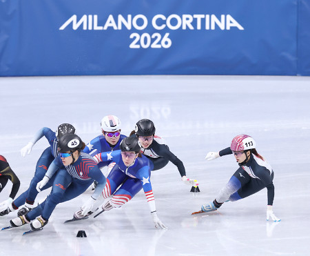 滑走する長森と渡辺 五輪