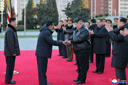 贈呈書を受け取る正恩氏