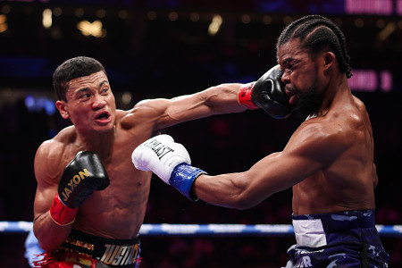 WBAスーパーライト級タイトルマッチは21日、米ラスベガスで行われ、同級1位の挑戦者、平岡アンディ(左)は王者ゲーリー・ラッセルに0―3の判定で敗れた=ゴールデンボーイ・プロモーションズ提供