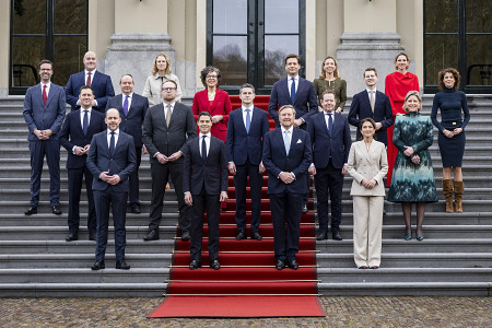オランダで23日、中道リベラルの「民主66」など3党による連立政権が発足し、民主66のイェッテン党首が首相に就任した。写真は、国王(最前列右から2人目)とイェッテン氏(同3人目)ら新内閣のメンバー。