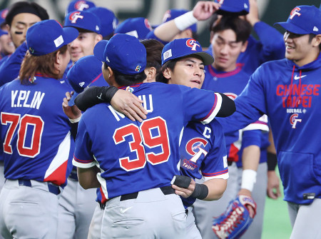抱き合って喜ぶ陳傑憲 野球