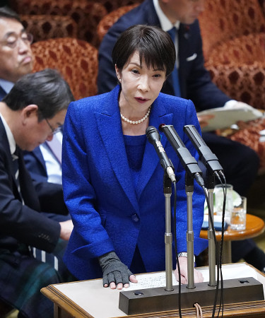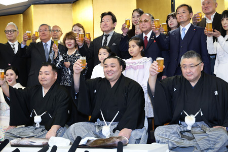 日本相撲協会は25日、エディオンアリーナ大阪で夏場所の番付編成会議と臨時理事会を開き、先の春場所で3度目の優勝を遂げた東関脇霧島の大関再昇進を満場一致で決めた。写真は伝達式で口上を述べる霧島(中央)。