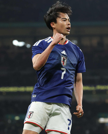 サッカーの国際親善試合は3月31日、ロンドンのウェンブリー競技場で行われ、日本代表はイングランド代表を1―0で破り、初勝利を挙げた。写真は前半、先制ゴールを決め、ガッツポーズする三笘。