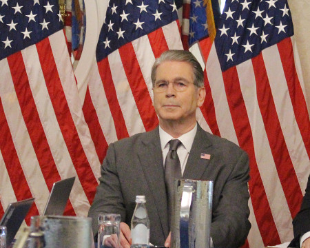 ベセント米財務長官は14日、時事通信を含む一部記者団の取材に応じ、連邦準備制度理事会(FRB)の金融政策運営について「利下げを行う前に様子見することもできる」との認識を示した=ワシントン